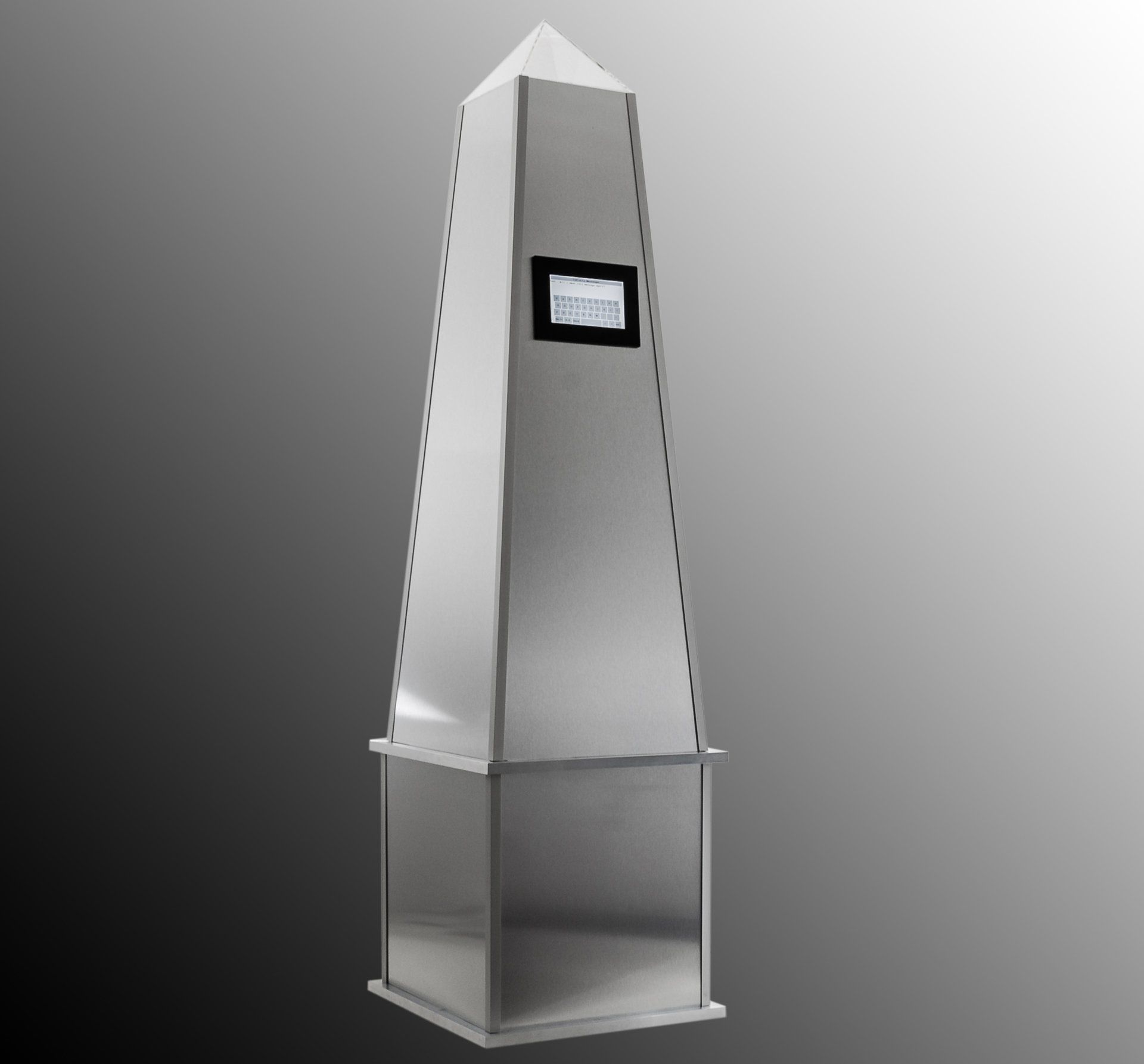 Ein mannshoher Obelisk. In der durchsichtigen Spitze sendet ein roter Laser Nachrichten in die Unendlichkeit.