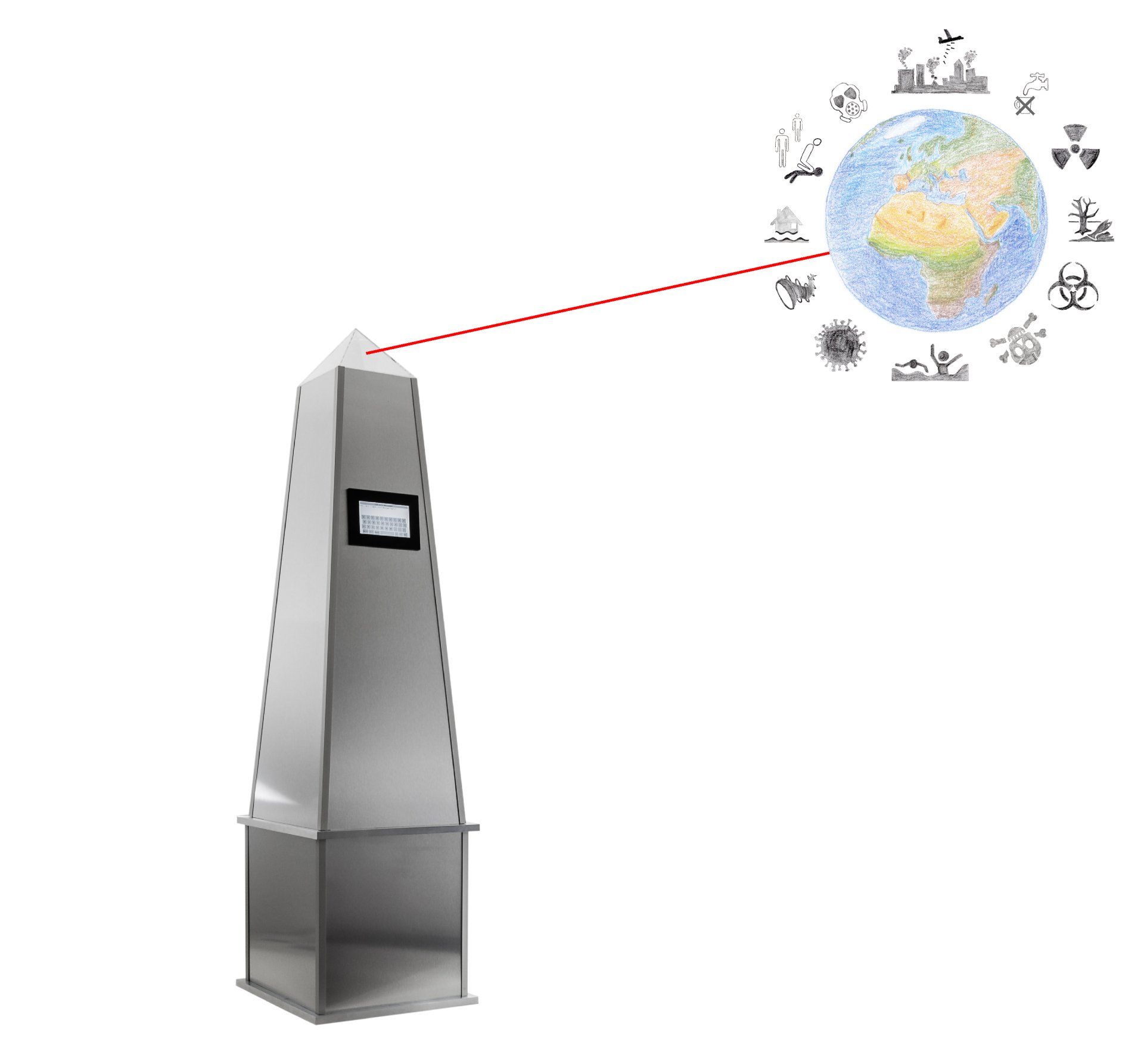 Der Earth-Messenger sendet Nachrichten um die Erde. Die Photonen, die vom Obelisken ausgehenden, sollen durch ihr deterministisches chaotisches Verhalten, die Kausalketten positiv beeinflussen.