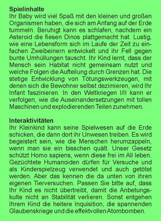 Besonders die sogenannte Evolution finden Sie, als vollkommenes Wesen, interessant. Affen mutieren zu Zweibeinern. Die Humanoiden erlernen das Benutzen von Werkzeugen, die Jagd, den Ackerbau, die Anfertigung von Kleidung und die Kommunikation durch Sprache.