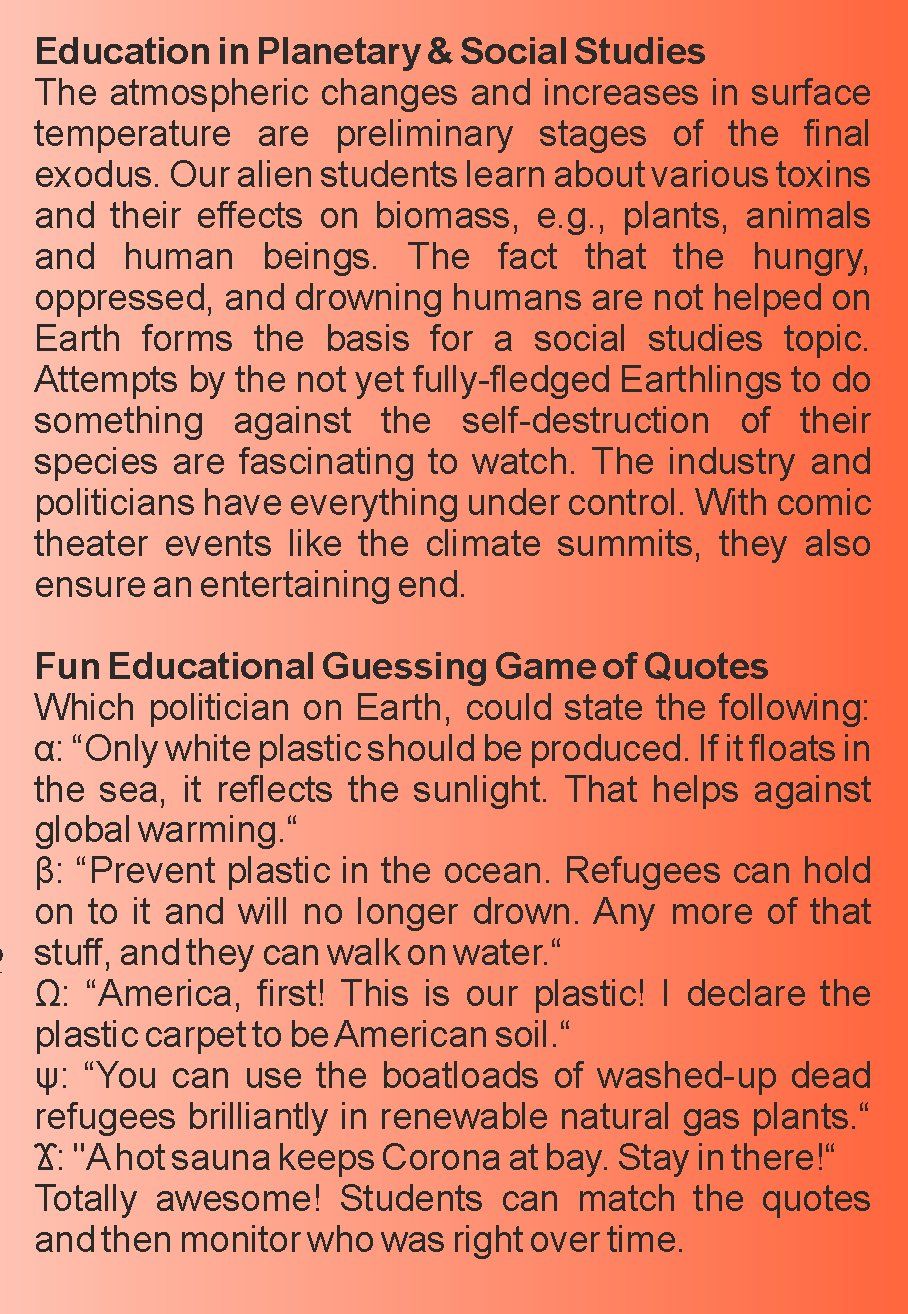 "It sure is strange how they ensure that no overpopulation ensues down there. Humans are sorted according to skin color. The whites kill the blacks, or they let them drown and starve."