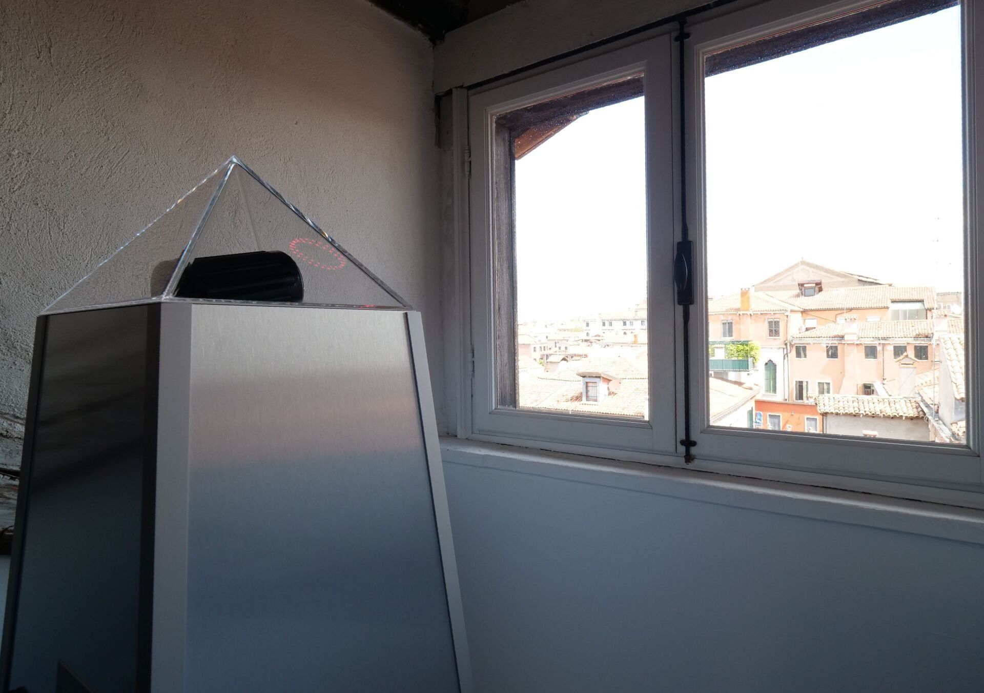 The touchscreen display features a keyboard that enables a personalized manual entry. A laser then beams the encoded text from the tip of the obelisk.